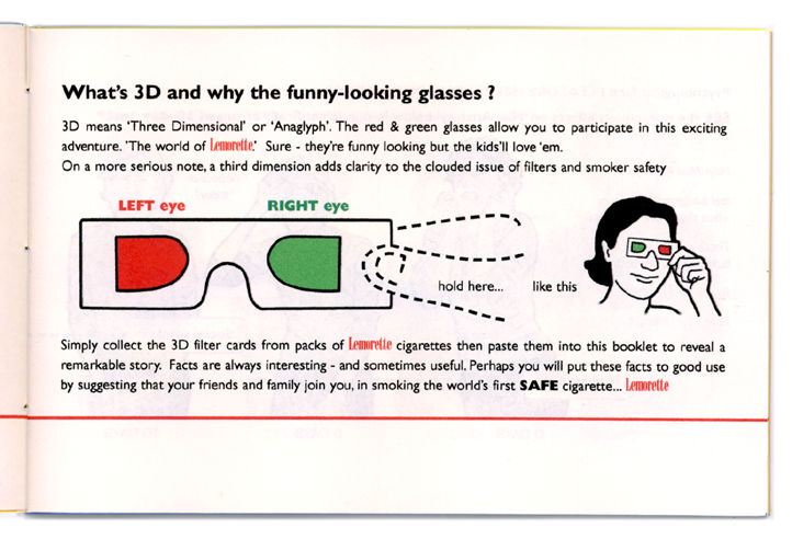 - A composite image that appears to have several levels when viewed with the red/green glasses. e.g. the image of the Lemorette factory on p.20, A Doctor Speaks... the image of Dr.Wolf's endorsement on p.2 and all six of the separate stuck-in cigarette cards.
